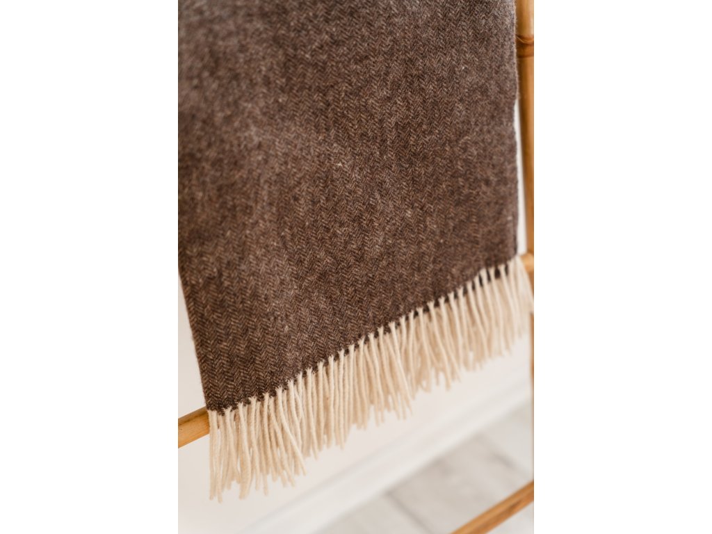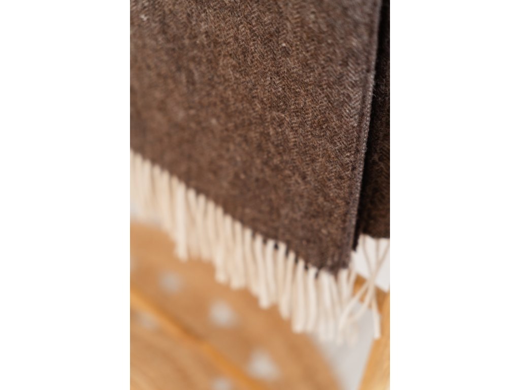De donkerbruin kleur en decoratieve franjes geven de deken een moderne en tijdloze uitstraling.