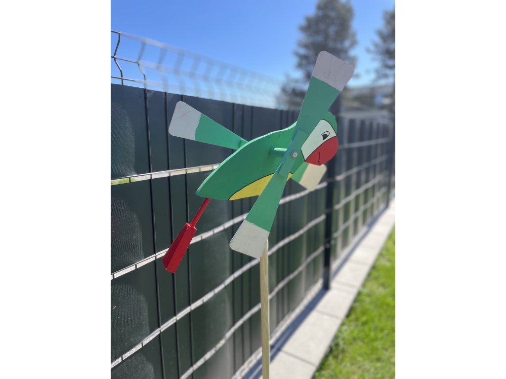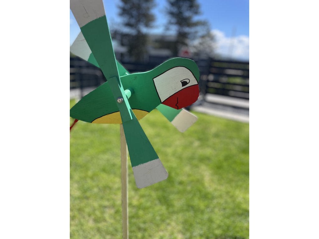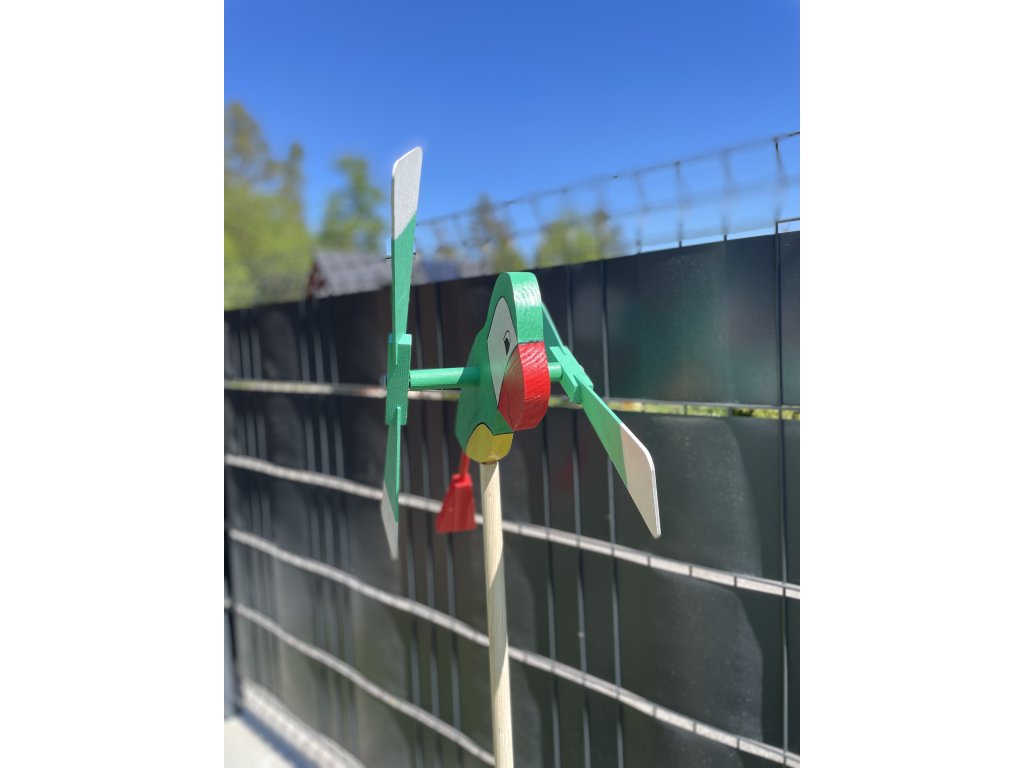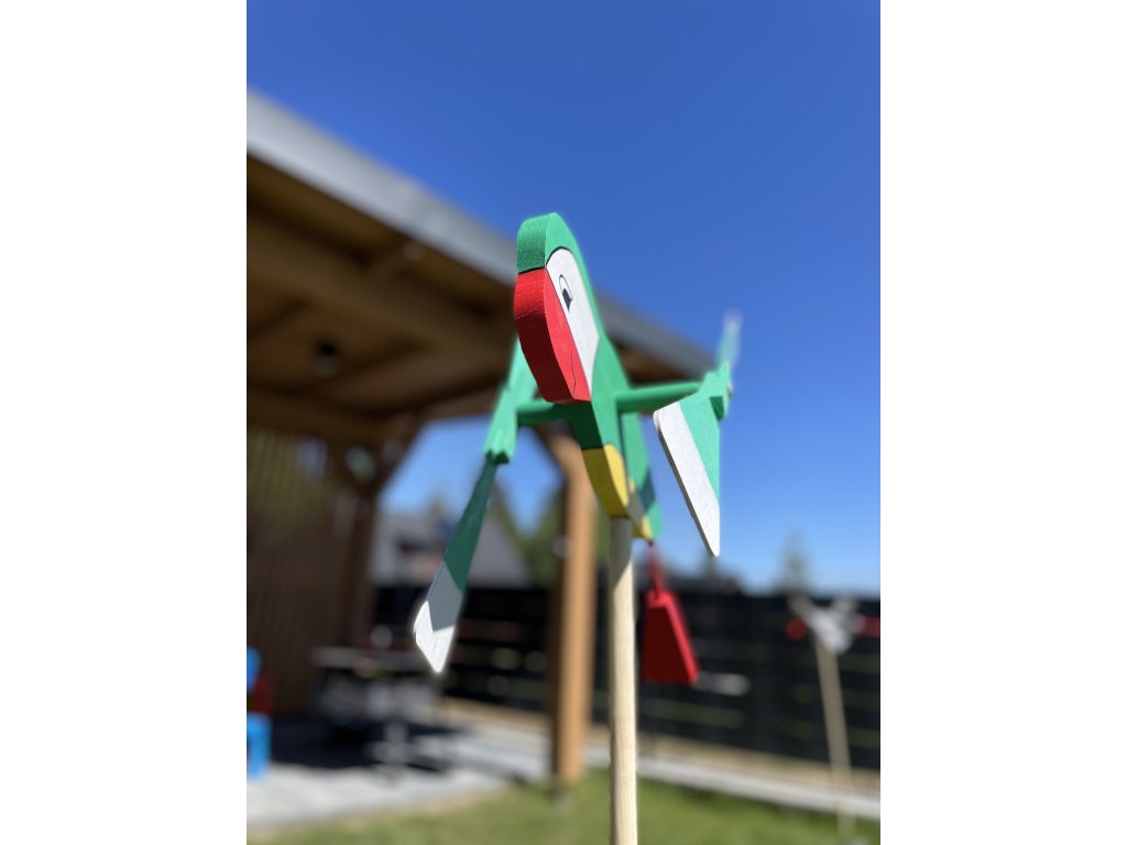 Drevená vrtuľka Papagáj – Farebný záhradný doplnok s pohyblivými krídlami