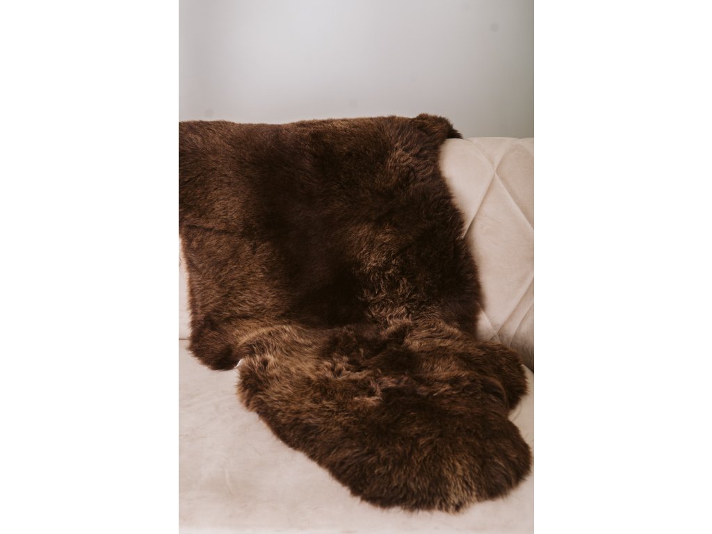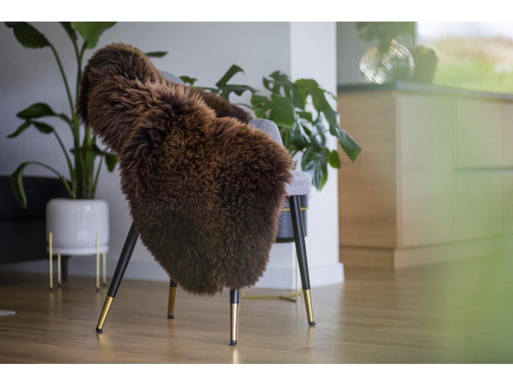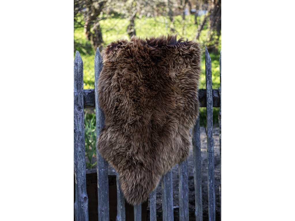 De donker bruin schapenvacht straalt een zuivere en elegante uitstraling uit en is ideaal voor Scandinavisch ingerichte interieurs.