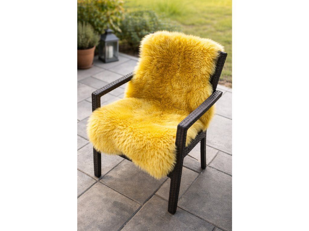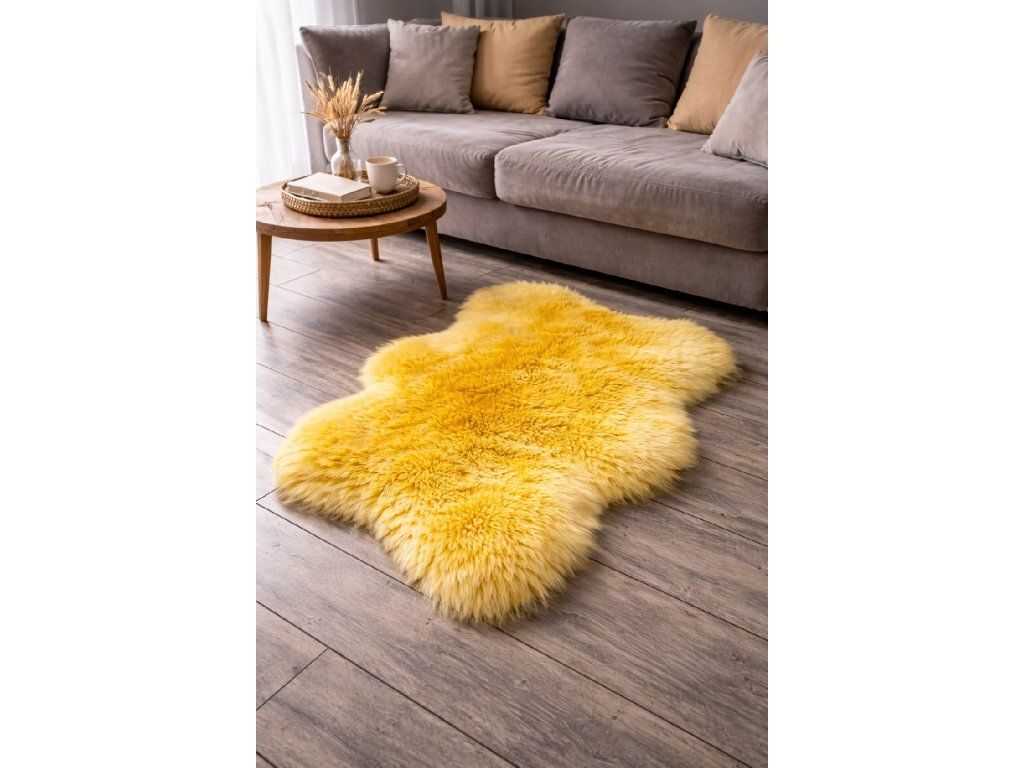 De geel schapenvacht straalt een zuivere en elegante uitstraling uit en is ideaal voor Scandinavisch ingerichte interieurs.