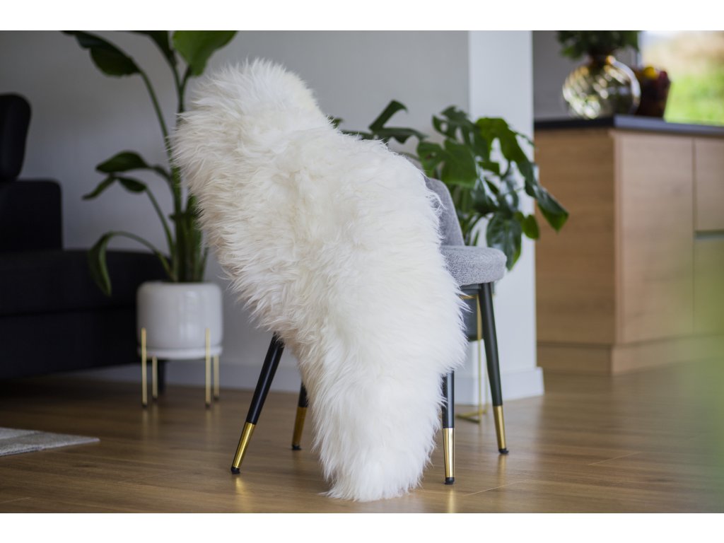 De wit schapenvacht straalt een zuivere en elegante uitstraling uit en is ideaal voor Scandinavisch ingerichte interieurs.