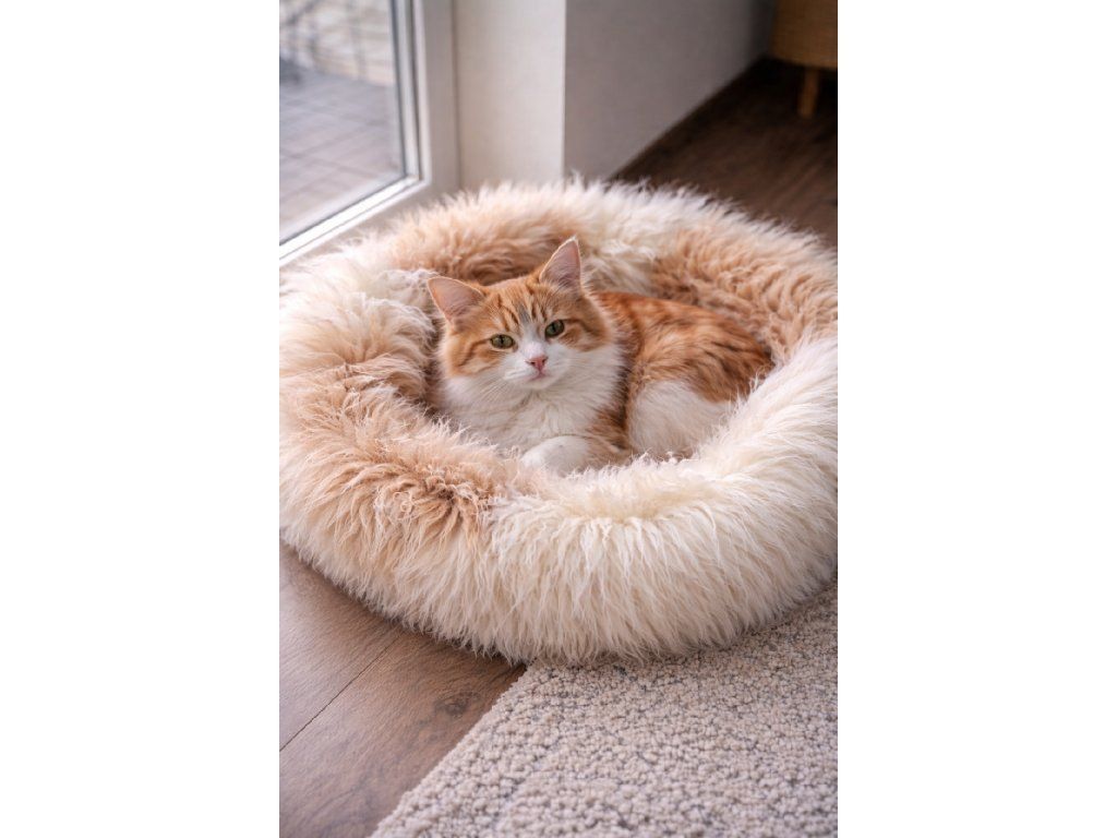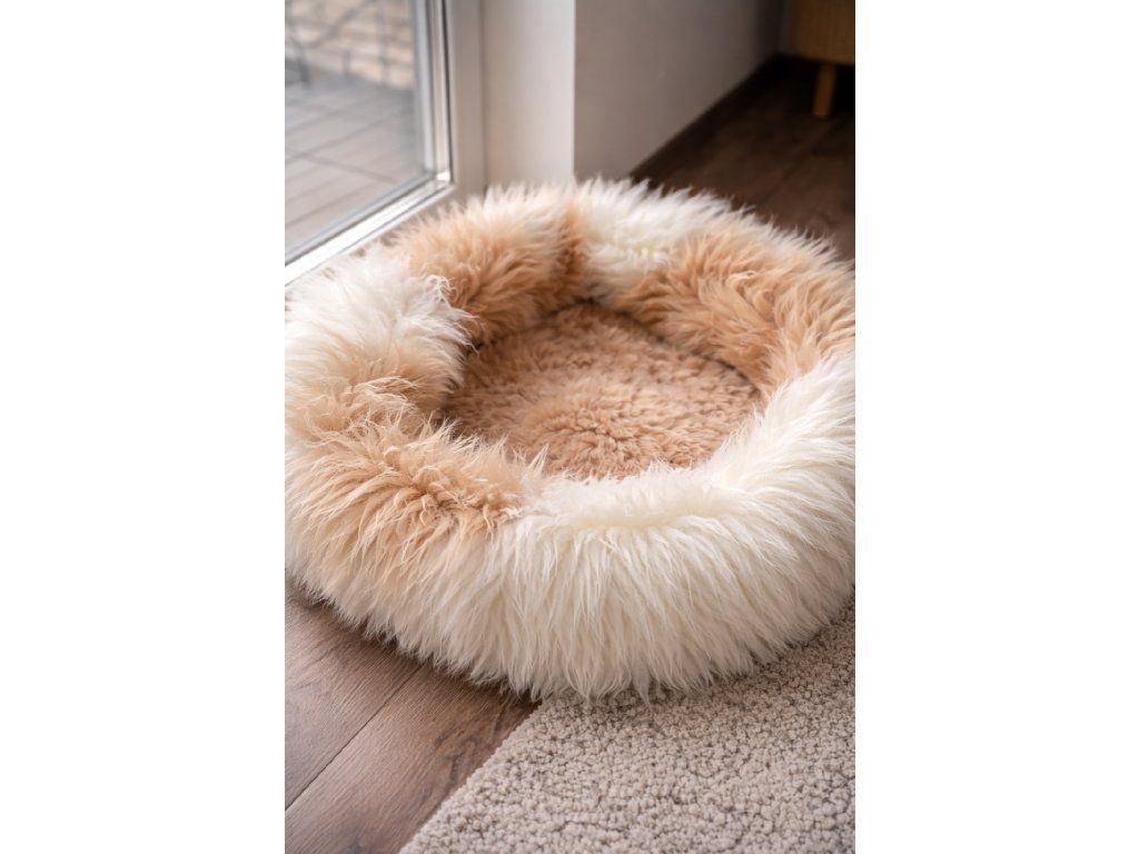Deze beige mand van echte schapenvacht is niet alleen een prachtig accessoire, maar ook een functioneel, gezond en duurzaam product dat uw huisdier een gevoel van veiligheid en zachte omhelzing biedt.