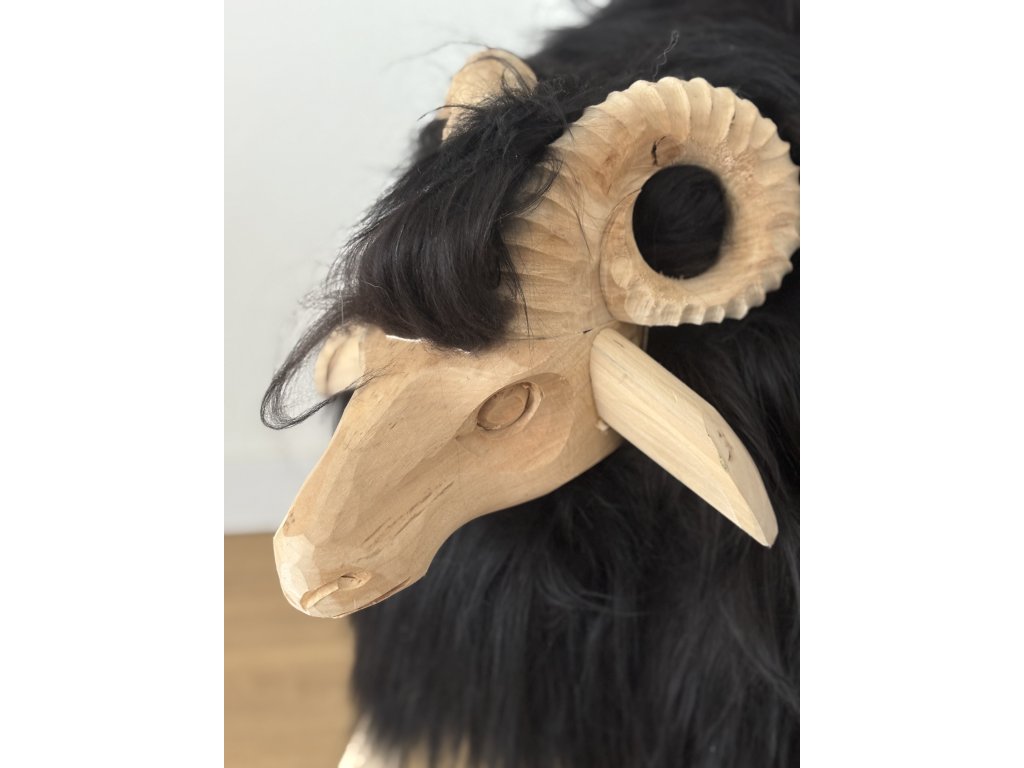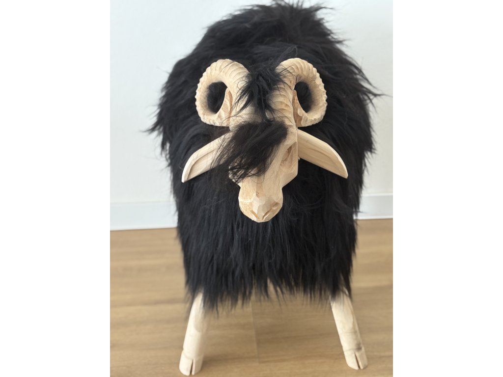 🐏 Stolička Baran Veľký Čierny – ručne vyrezávaný dizajn s pravou ovčou kožušinou 🐑
